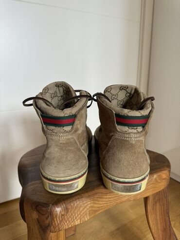 - Detalji: metalne šestougaone rupice za pertle, kožne braon pertle, zadnji deo sa zeleno‑crvenom Gucci trakom