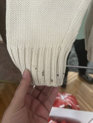 - Materijal: gusto, krupno pletivo (prijatno, toplo; elastične rebraste manžetne i porub)