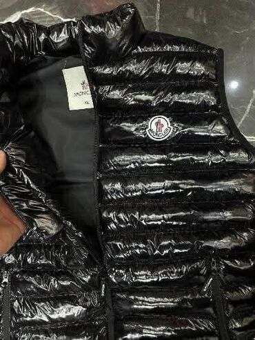 Muški prsluk – crni, visokog sjaja, pufnasti/štepani. - Materijal: sjajna, vodoodbojna tkanina sa horizontalnim štepovima. - Punjenje: toplo i lagano (pufnasta struktura). - Kroj: bez rukava, blag...
