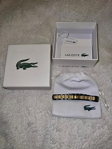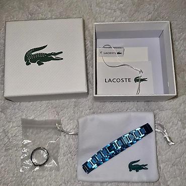 - Lacoste narukvice od nerđajućeg čelika u više varijanti boja: plava, crno‑zlatna i srebrna. Člančani dizajn sa teksturisanim segmentima i diskretnim brend detaljima. Metalna preklopna kopča. U kompletu dolaze brendirana kutija, uputstva/kartice i bela meka vrećica sa vezicom. U paketu je i prsten u zasebnoj kesici.