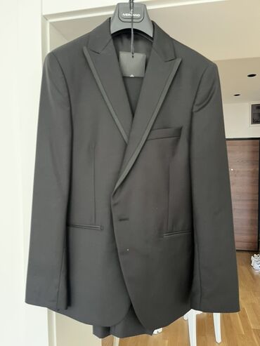 Prodajem muško odelo, smoking, crne boje. Pantalone su na slici zbog svetlosti ispale teget, ali se na slici sa sakoom vidim da je sve iste boje, crne. Kvalitetno, 100% vuna. Nošeno je jednom. Bez tragova korišćenja. Poseduje etiketu, deklaraciju, na kojoj se vide marerijal, veličina i cena. Uz odelo dolazi i bela košulja. Veličina 50. Marka Ivergano.