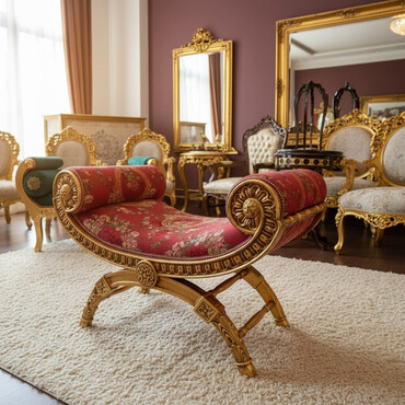 Barokne/rokoko stolice sa bogato rezbarenim ramovima u zlatnoj boji i raskošnom tapacirungom. Nasloni i sedalni delovi presvučeni su crvenim štofom sa goblen-vezom floralnog motiva (beli, ružičasti...