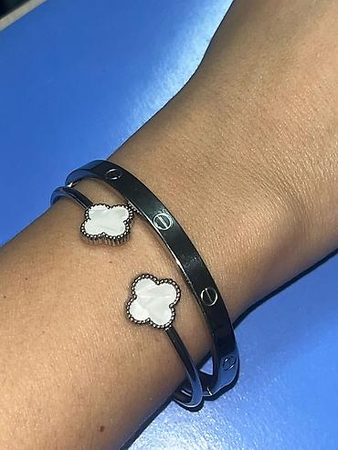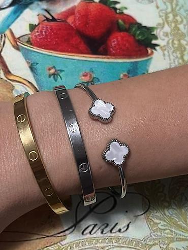 - Otvorene narukvice sa dva deteta u obliku četverolista od belog nacre/majčinog bisera (detaljna perlasta ivica).