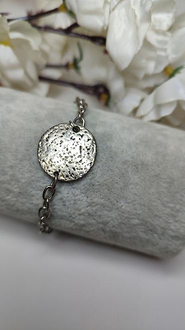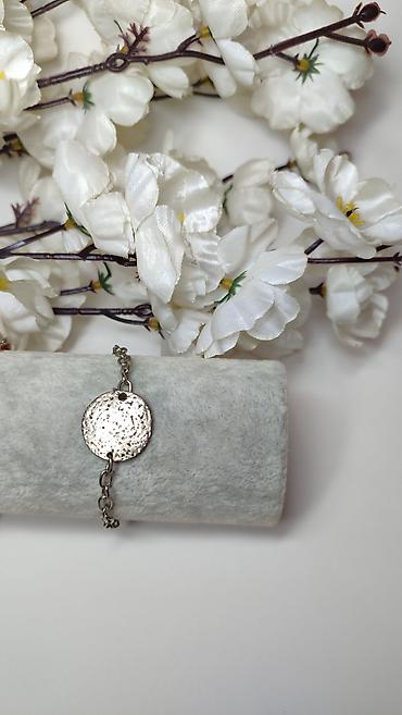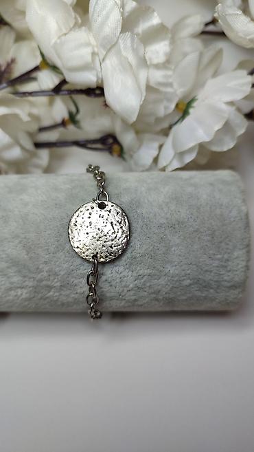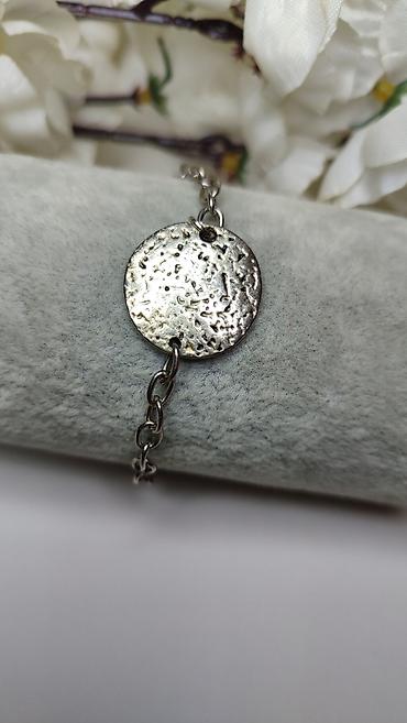 - Dizajn: tanka lančana narukvica sa okruglim medaljonom u sredini