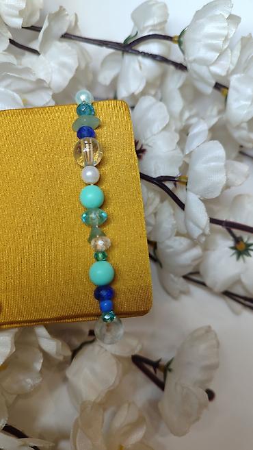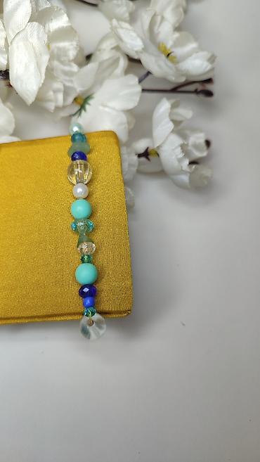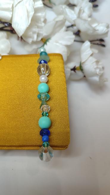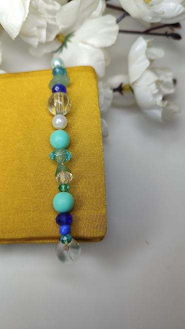 - Dizajn: asimetričan niz perli u nijansama akva, tirkizne, morske zelene i kraljevski plave, sa transparentnim i bisernim akcentima.
