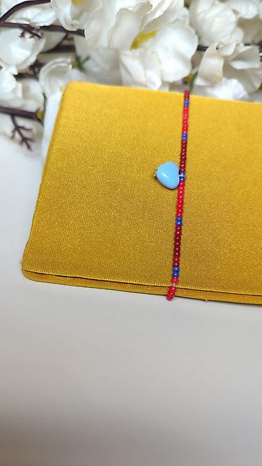 Narukvica od sitnih perlica – crvena sa priveskom srce - Ručno nizana narukvica od sitnih crvenih staklenih perlica - Centralni detalj: minijaturno svetloplavo srce (email/kamenčić) sa metalnim el...