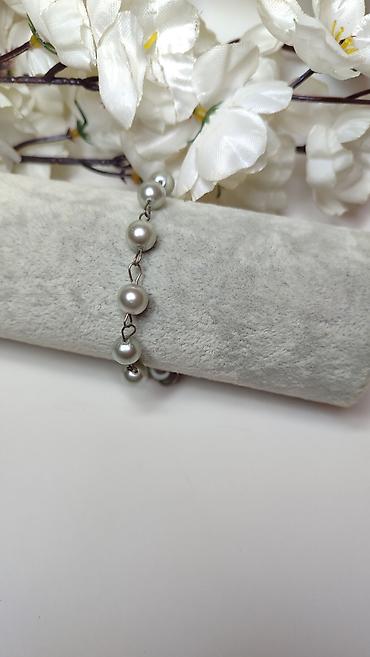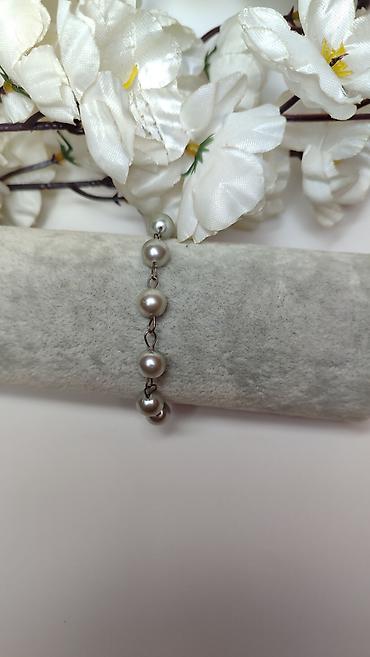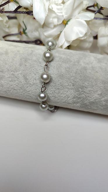 - Elegantna narukvica sastavljena od niza okruglih, svetlucavih bisernih perli u hladnoj sedefasto-sivoj nijansi.