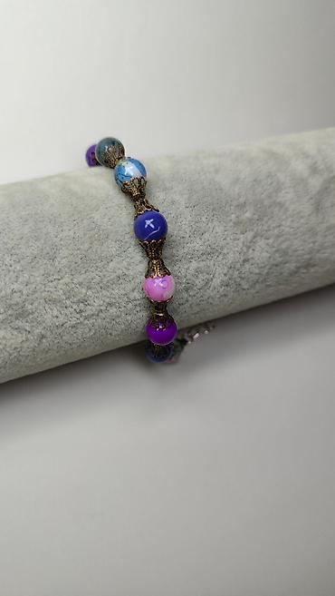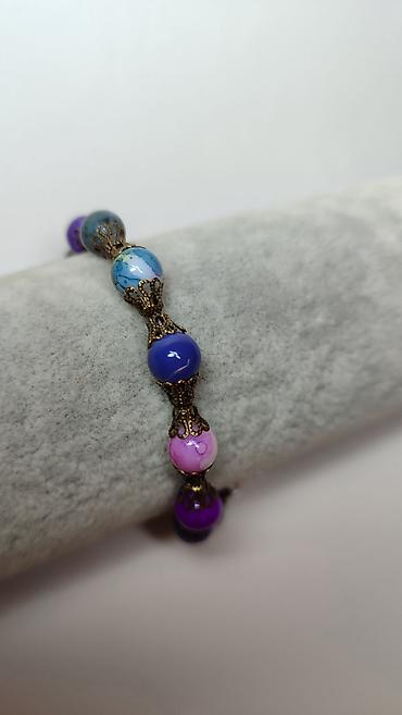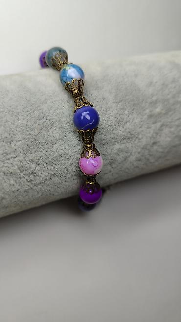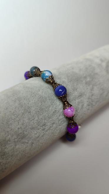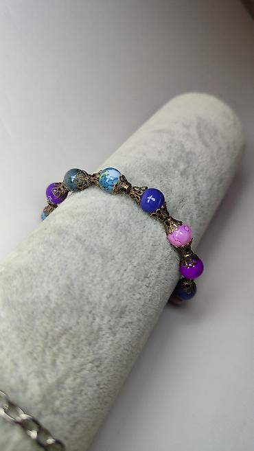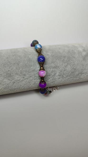 - Rukotvorina sa okruglim perlama u nijansama ljubičaste, roze, plave i tirkizno-plave