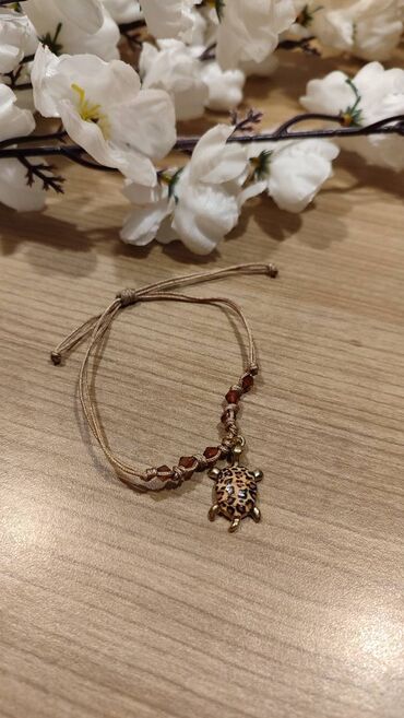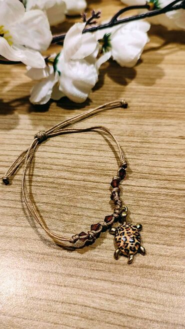 - Bež konac kombinovan sa ukrasnim smeđim perlama/čvorovima duž jednog dela narukvice.
