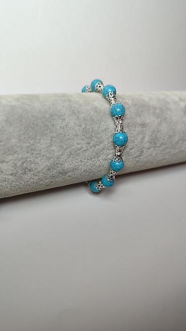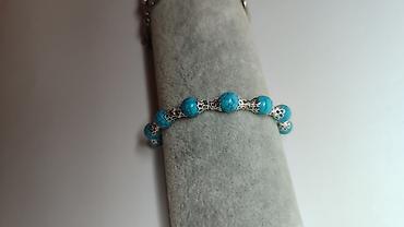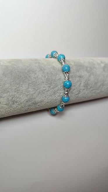 - Elegantna narukvica izrađena od kružnih tirkizno-plavih perli sa efektnim „mrežastim” šarama.