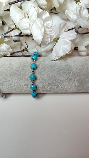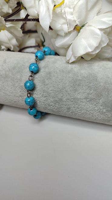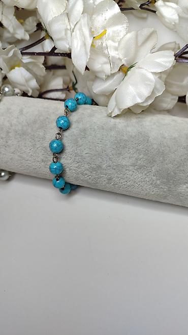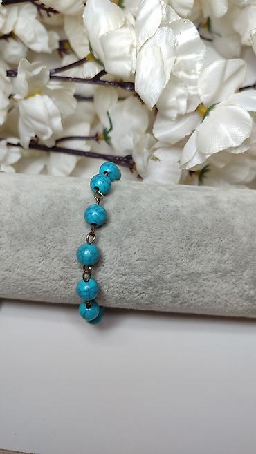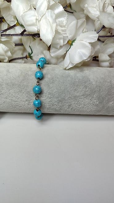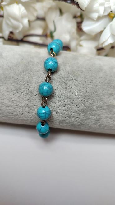 Ručno rađena narukvica od sitnih perlica u intenzivnoj kraljevsko plavoj boji, akcentovana nizom perlica u nijansama tirkizno‑plave i centralnim staklenim privjeskom u obliku srca u akvamarin tonu....