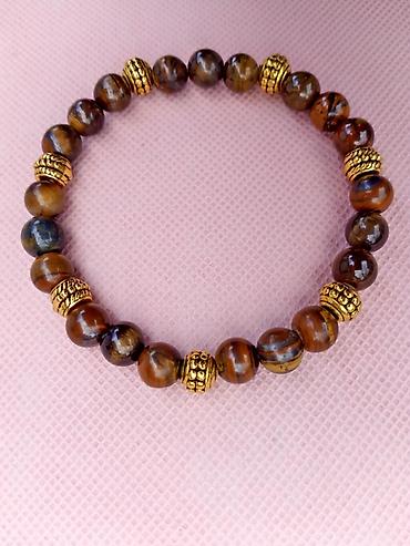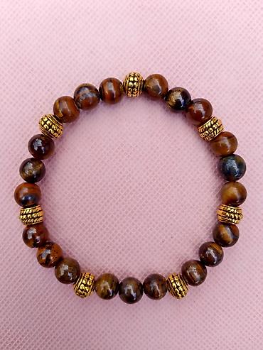 - Materijal: prirodni poludragi kamen Tigrovo Oko, sjajne kuglice sa karakterističnim smeđe‑zlatnim šarama; ukrasne metalne distancere u zlatnoj boji.