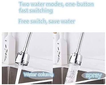 gibljivi -fleksibilni produžni kabl, 360 stepeni, izliv sa aeratorom i dve funkcije vodenog mlaza. Sa univerzalnom mlaznicom, odgovara svim slavinama. Može da se rotira za 360 stepeni i izuzetno je zgodan za pranje sudova, voća i povrća i još mnogo toga. Vrsta vodenog mlaza se može promeniti samo jednim dugmetom, prema željama - širokim tušem za pranje i uskim mlazom za punjenje sa koncentrisanom snagom.