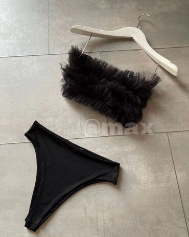 Crni dvodelni kupaći kostim - Model: bandeau gornji deo bez bretela + klasičan donji deo - Materijal/tekstura: mrežasti, elastičan materijal sa 3D teksturom na korpama; bočne strane gornjeg dela o...