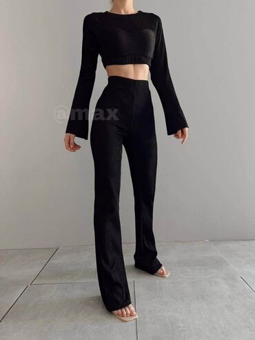 Ovaj ženski dvodelni komplet uključuje široke pantalone sa visokim strukom i gornji deo dugih rukava. Pantalone su sa širokim nogavicama i vezicama u struku, pružajući udobnost i slobodu pokreta. G...