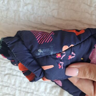 Dečiji zimski kombinezon sa kapuljačom kao nov - Veličina: 98 (etiketa vidljiva na fotografiji) - Boja i dezen: tamnoplava osnova sa šarenim tačkicama/krugovima u roze, beloj i sivoj; unutrašnjos...
