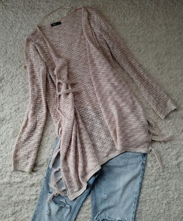 Nezno svetlo roze dugacki kardigan dzemper sa resicama.