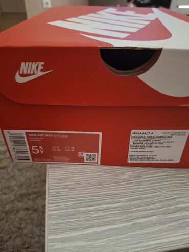 Patike Nike Air Max 270 (GS) u crnoj boji, veličine US 5.5Y. Dizajnirane su za udobnost i stil, sa prepoznatljivim Air Max jastučićem koji pruža odličnu amortizaciju. Idealne su za svakodnevno nošenje i sportske aktivnosti, nudeći podršku i fleksibilnost. Gornjište je od prozračnog materijala sa perforacijama koje omogućavaju ventilaciju, dok pertle osiguravaju sigurno prianjanje uz stopalo.