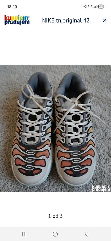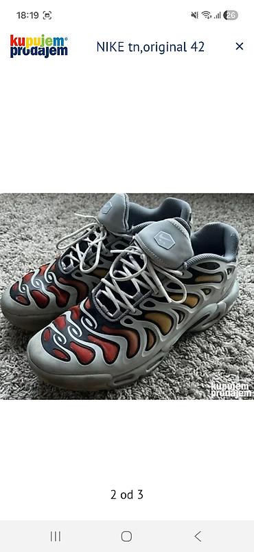 Klasični “Tuned Air” silueta sa upečatljivim talasastim linijama i retro izgledom. Savršeno za svakodnevno nošenje i ljubitelje TN serije. Veličina i naziv artikla navedeni su u oglasu: “NIKE tn, original 42”.