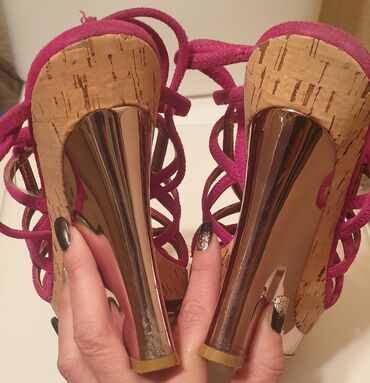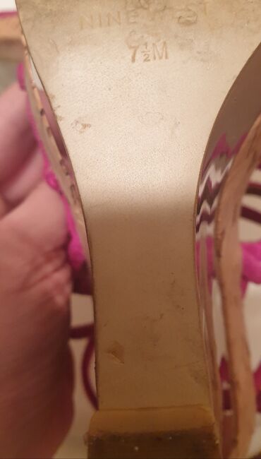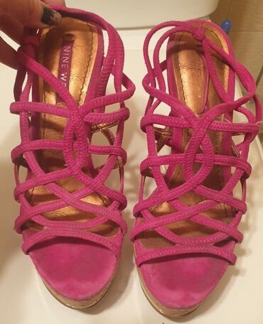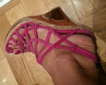 Nine West, roze ciklama boje sandale sa prepletenim kaiševima. Br.je 37,5. Kožne,udobne,original. Nosene mozda 2-3 puta. Zlatna platforma i pluta. Interesantne, u kombinaciji sa kozom i plutom..