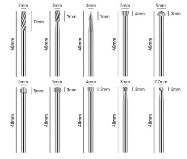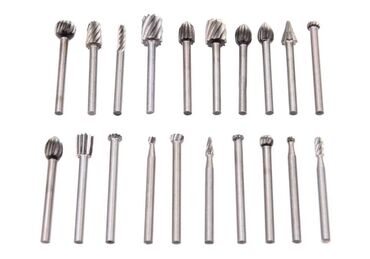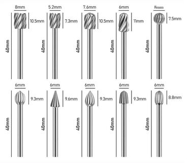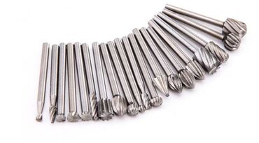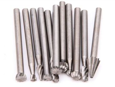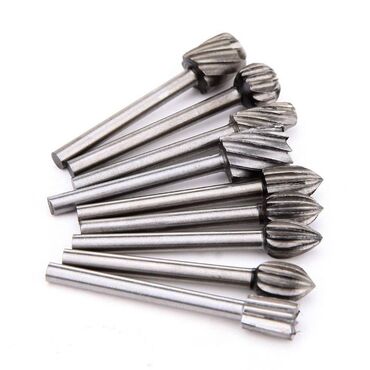 Deset novih glodala za drvo raznih oblika, presvučene su titaniumom. Namenjene su za biaks (Dremel, Proxxon. . . ). Vratilo prečnik 3 mm.Stanje: