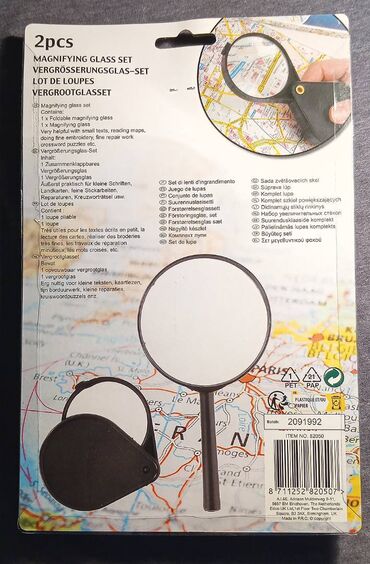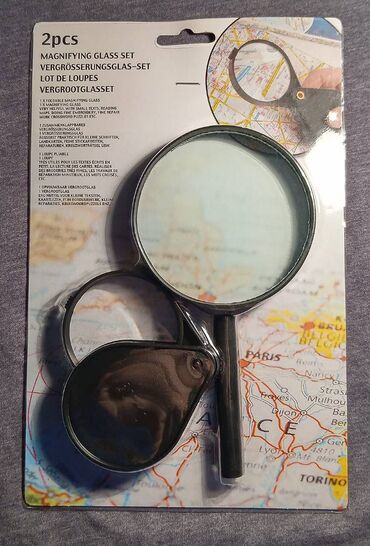 NovoNov komplet dve lupe. Jedna sklapajuća može da stane u džep prečnik ove manje lupe je 6 cm a ima uveličanje 10x. Druga veća lupa sa drškom ima prečnik 9 cm.