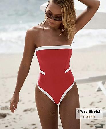 - Dizajn: klasičan jednodelni model bez naramenica (strapless) sa kontrastnim belim obrubima duž dekoltea, izreza za noge i bočnih detalja.
