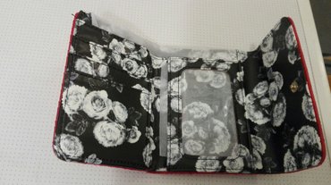 Desigual novcanik ukrasen kruznim motivima,sa nekoliko pregrada za kartice ili dokumenta,pregradu za sitan novac .. Dim.sklopljenog 19x12cm.. dim .rasklopljenog novcanika 33cm.....+381 63 4562xx