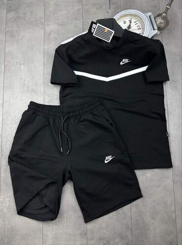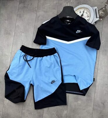 Muški komplet trenerki – dva modela 1) Nike komplet: - Gornji deo na rajsferšlus, visoka kragna - Boje: crna sa plavim ramenima i belim detaljima/linijama - Diskretni Nike Swoosh logotipi na jakni...