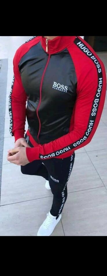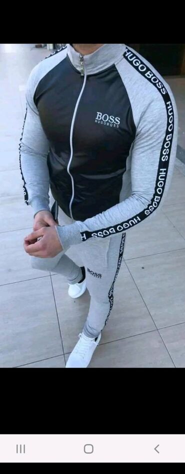 Muški komplet trenerke – duks sa kapuljačom i donji deo - Model: duks na rajsferšlus sa kapuljačom + pantalone sa elastičnim pojasom - Brendirane trake sa strane sa natpisom HUGO i diskretan zlatn...