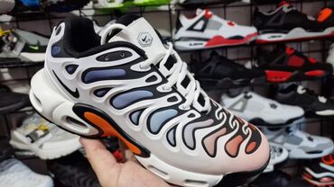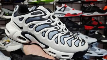 Nike Air Max Plus (TN) patike - Gornjište: mrežasta i sintetička tkanina sa talasastim TPU “kavezom” za strukturu i stabilnost - Boja: siva sa crnim detaljima, plavi Swoosh i akcenti u nijansama p...