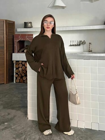 Komplet ženske pletene trenerke – rolka džemper + široke pantalone - Materijal: prijatna rebrasta trikotaža, meka i elastična, idealna za hladnije dane - Gornji deo: rolka, opušten kroj, dugi ruka...