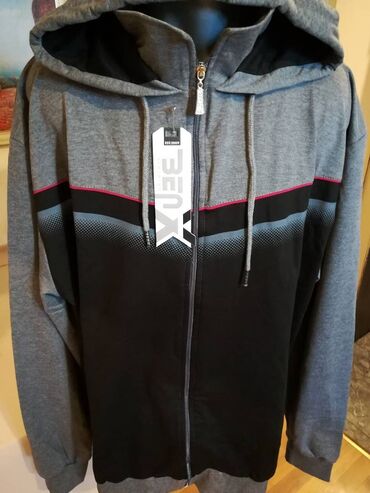 Novi muski duks sa kapuljacom u velikom broju Benx 5XL. Turski. Odlican muski duks za muskarce svih uzrasta. Uradjen od prijatnog i vrlo kvalitetnog materijala. Lagan, komotan, vrlo lepog dezena, lako se kombinuje sa bilo kojim komadom garderobe. Izuzetan muski duks koji ima dva dzepa sa prednje strane, kapuljacu, kragnu i kopca se na rajferslus. Duks, takodje, ima ranflu na rukavima i dole na donjem rubu dukserice kao i uckur za zatezanje na kragni i kapuljaci. Super ide na farmerke, pantalone i trenerke. Mogu ga nositi i punije osobe sa preko 100 kg. Pamucna muska dukserica sa kapuljacom Benx je nova sa etiketom.