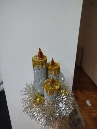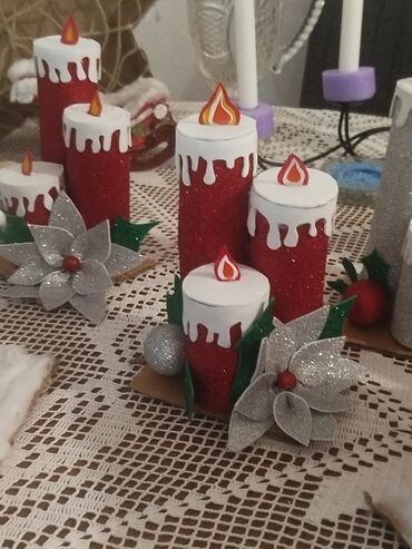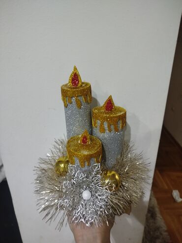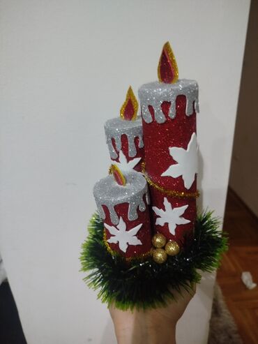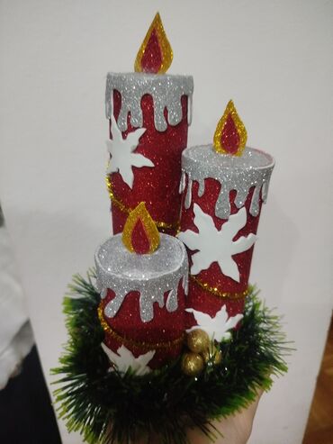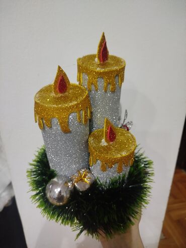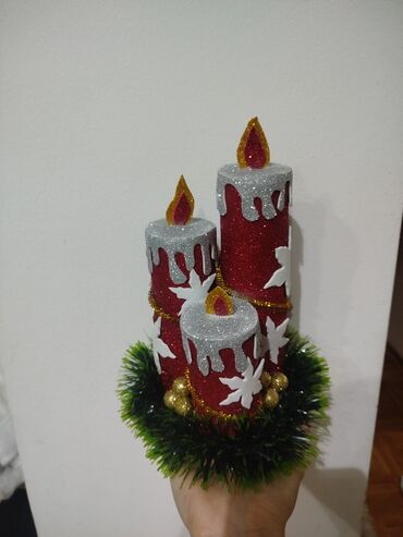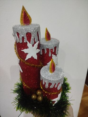 Set ukrasaNovogodišnji dekor – set od tri ukrasne “sveće” od šljokičastog eva/penastog kartona, postavljene na kružnoj osnovi sa zimzelenim venčićem.