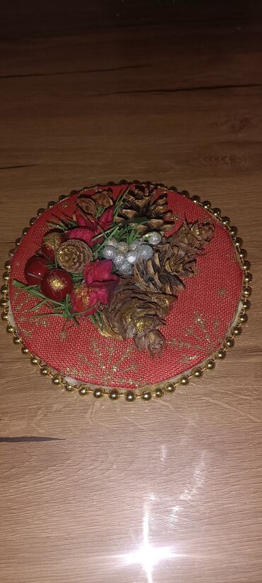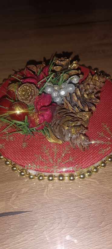 Ručni novogodišnji dekorativni aranžman na podlošci.