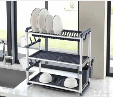- Konstrukcija na 3 nivoa: gornji nivo sa držačem/utorima za tanjire, dva donja nivoa za činije, šolje i tiganje