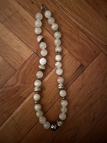 - Ručno nanizane okrugle perle u nijansama mlečno‑bele, bež i braon, sa diskretnim prugastim šarama.