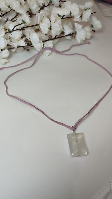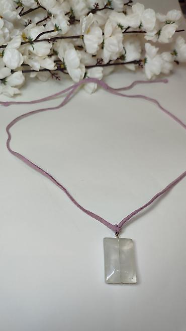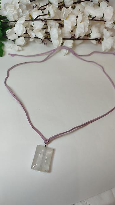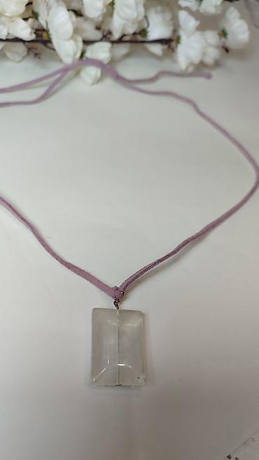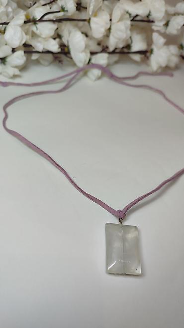 - Materijal: pravougaoni prozirno-mlečni kamen/akrilni privjesak, blago fasetiran, okačen metalnim alkicama