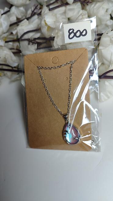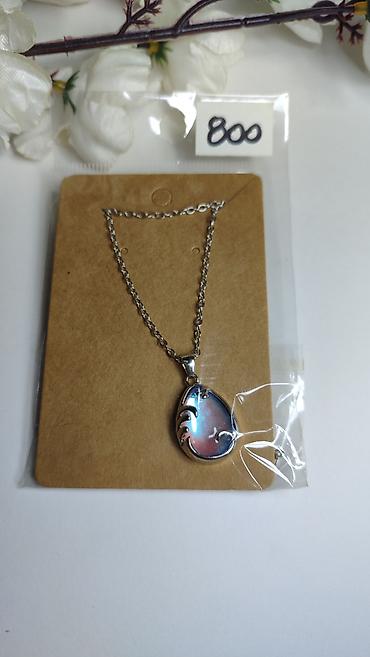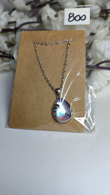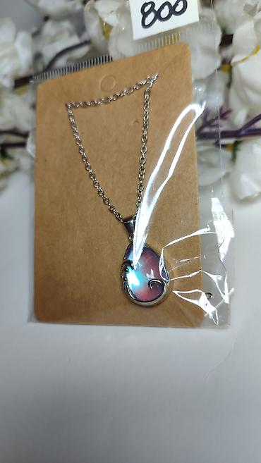 - Privjesak: suzast oblik sa dekorativnim, talasastim detaljima; sjajni, iridescentni kabohonski kamen koji menja nijanse (plava–ljubičasta–ružičasta) u zavisnosti od svetla