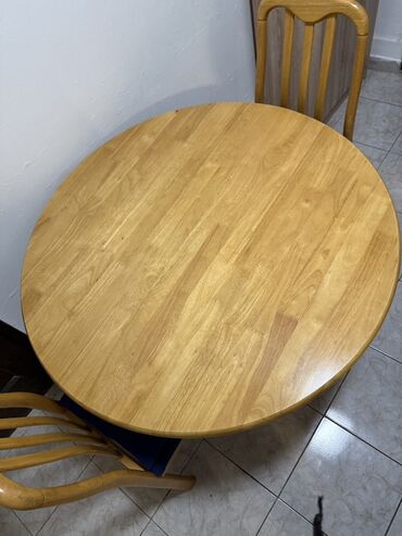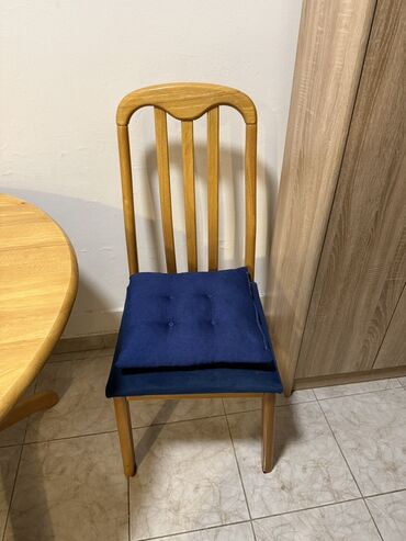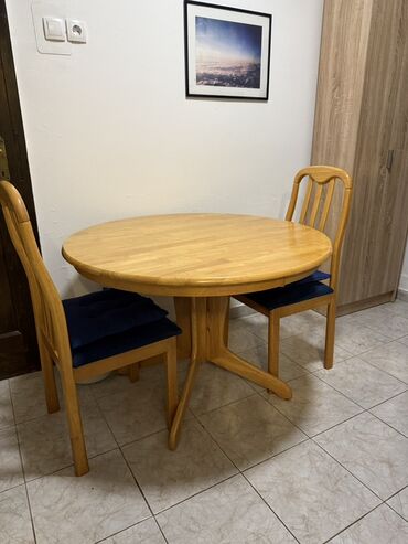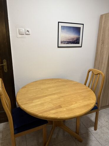 Praktičan trpezarijski set koji se sastoji od okruglog stola i tri stolice, idealan za male prostore. Sto ima centralno postolje koje pruža stabilnost i omogućava udobno sedenje bez prepreka. Stolice su izrađene sa punim naslonom i tamnoplavim jastucima, pružajući udobnost tokom obroka ili druženja. Svetla boja drveta doprinosi toplini ambijenta i lako se uklapa u različite stilove enterijera. Set je pogodan za kuhinje, trpezarije ili manje dnevne sobe, nudeći funkcionalnost i estetiku.