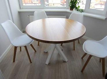 Drvena garnitura za dvorište/spomen‑parcele – sto i dve klupe - Materijal: pun masiv (lakiran), sa izraženom teksturom drveta - Set sadrži: okrugli sto i dve stabilne klupe sa naslonom - Dizajn: r...