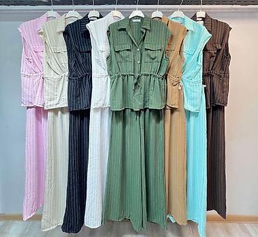 Komplet široke pantalone visokog struka na lastiz i bocnim dzepovima sa ravim stepom po sredini nogavica i majica siroka kratkih rukava do lakta. Duže nogavice 120cm. Pamuk kvalitetan sa elastinom....
