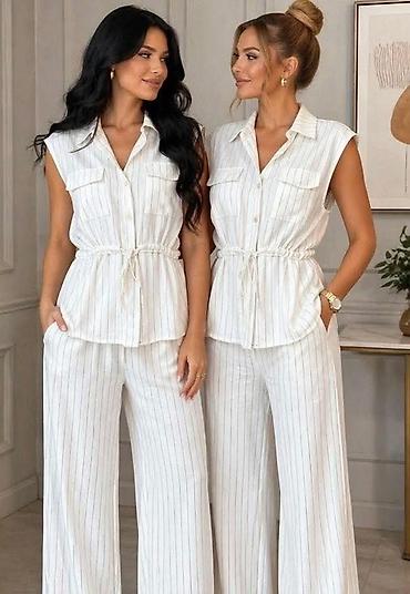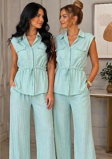 Komplet “Emi Moda – Made in Italy” - Dvodijelni ženski komplet od lagane tkanine: košulja kratkih rukava + široke pantalone. - Košulja: klasični kragna-rever, kopčanje na dugmad, opušten kroj za s...