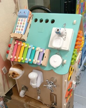 ⚡Karakteristike: Sadrži različite elemente poput zupčanika, ksilofona, brave, kvake, prekidača i drugih interaktivnih delova. Ima muziku.