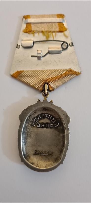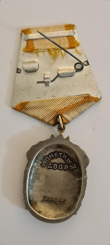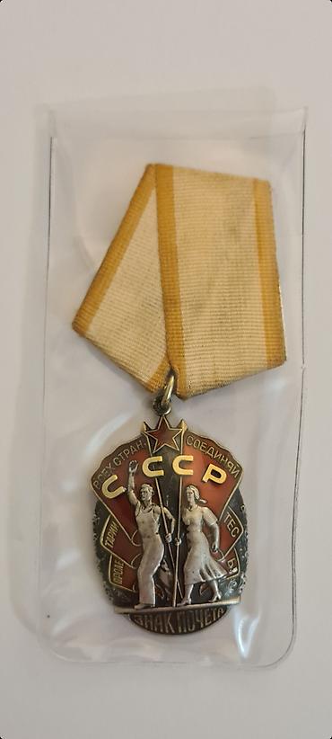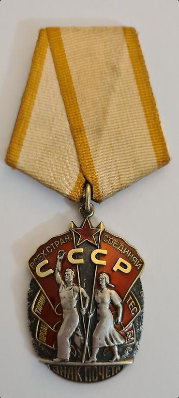 - Sovjetski orden sa lentom u bež boji sa zlatno-žutim rubovima i metalnim trokutastim nosačem sa iglom.