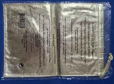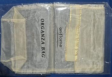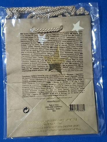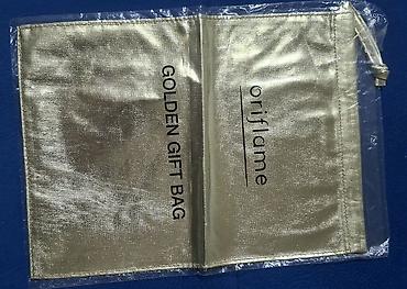 - Zlatna tekstilna vrećica sa učkurom: „Golden Gift Bag“ (Oriflame). Dimenzije približno 18 × 24 cm (navedeno na pakovanju). Mekana, sjajna tkanina sa zatezanjem pomoću vrpce, idealna za elegantno pakovanje poklona.
