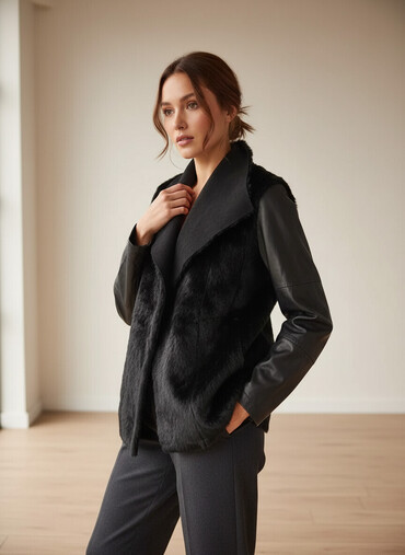 Elegantma ženska bunda od pravog zečijeg krzna - Dizajn: kraći kroj do kukova, klasična kragna, ravne duge rukave. - Tekstura: mekano, gusto krzno sa diskretnim šarama u tonu (svetli kvadratni/šat...