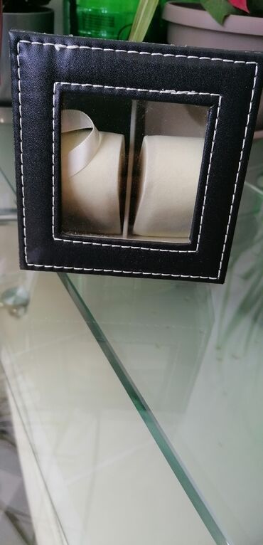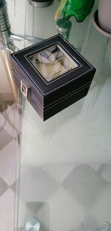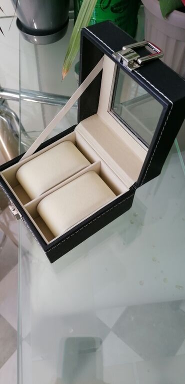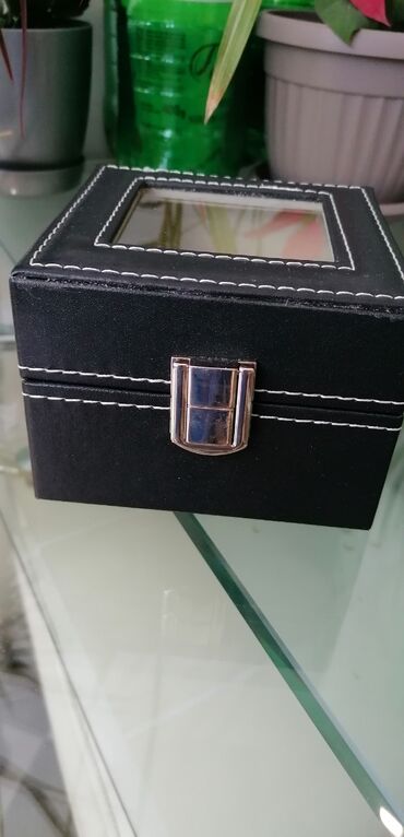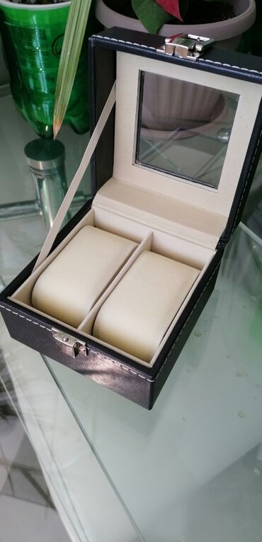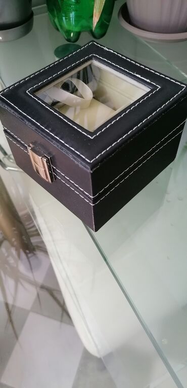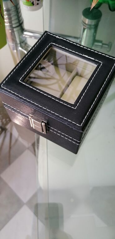 KUTIJA ZA SATOVE dva odeljka i jastučića, unutrašnjost obložena plišom, eko koža, 11x11x8 cm.