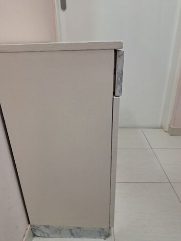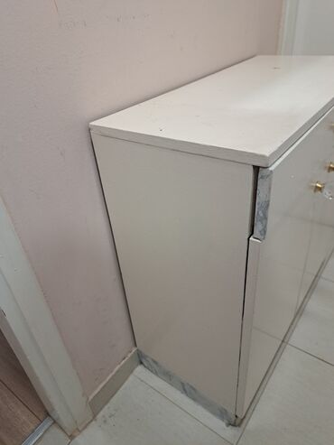 Ugaona komoda 80 x 130 cm, visina 70 cm. Izrađena u kombinaciji drveta i šperploče. Boja: trula višnja. Karakteristike: - Trokutasta (za ugao), sa širokom gornjom pločom - Više otvorenih polica: c...