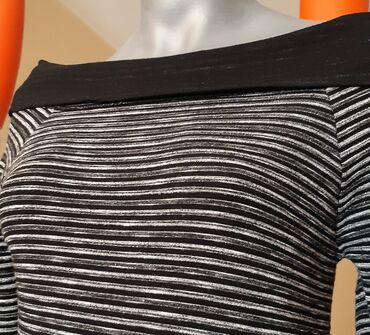 OXXO ženska majica na pruge, model sa širokim rubom oko izreza koji može da se nosi spušteno preko ramena. Dugački rukavi, pripijen kroj, elastična tkanina u crno-sivim prugama.